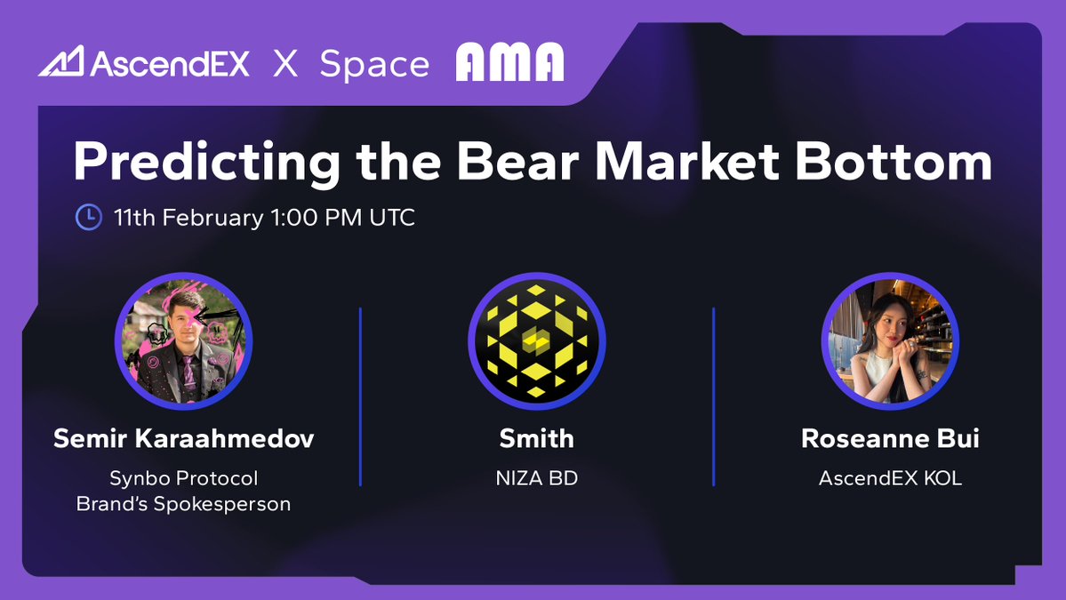 2026年2月11日,AscendEX 在 X Space 举办了主题为 "Predicting the Bear Market Bottom(预测熊市底部)" 的AMA活动。本次对话汇集了三位嘉宾:SYNBO Protocol 品牌代言人 Semir Karaahmedov 、NIZA Ecosystem 代表 Smith ,以及 AscendEX KOL Roseanne Bui。