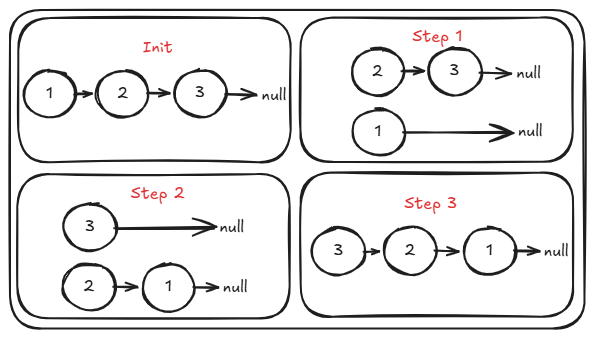 | 步骤 | curr | next (temp) | 操作 (curr.next = prev) | 状态变化 | prev 更新 | curr 更新 |