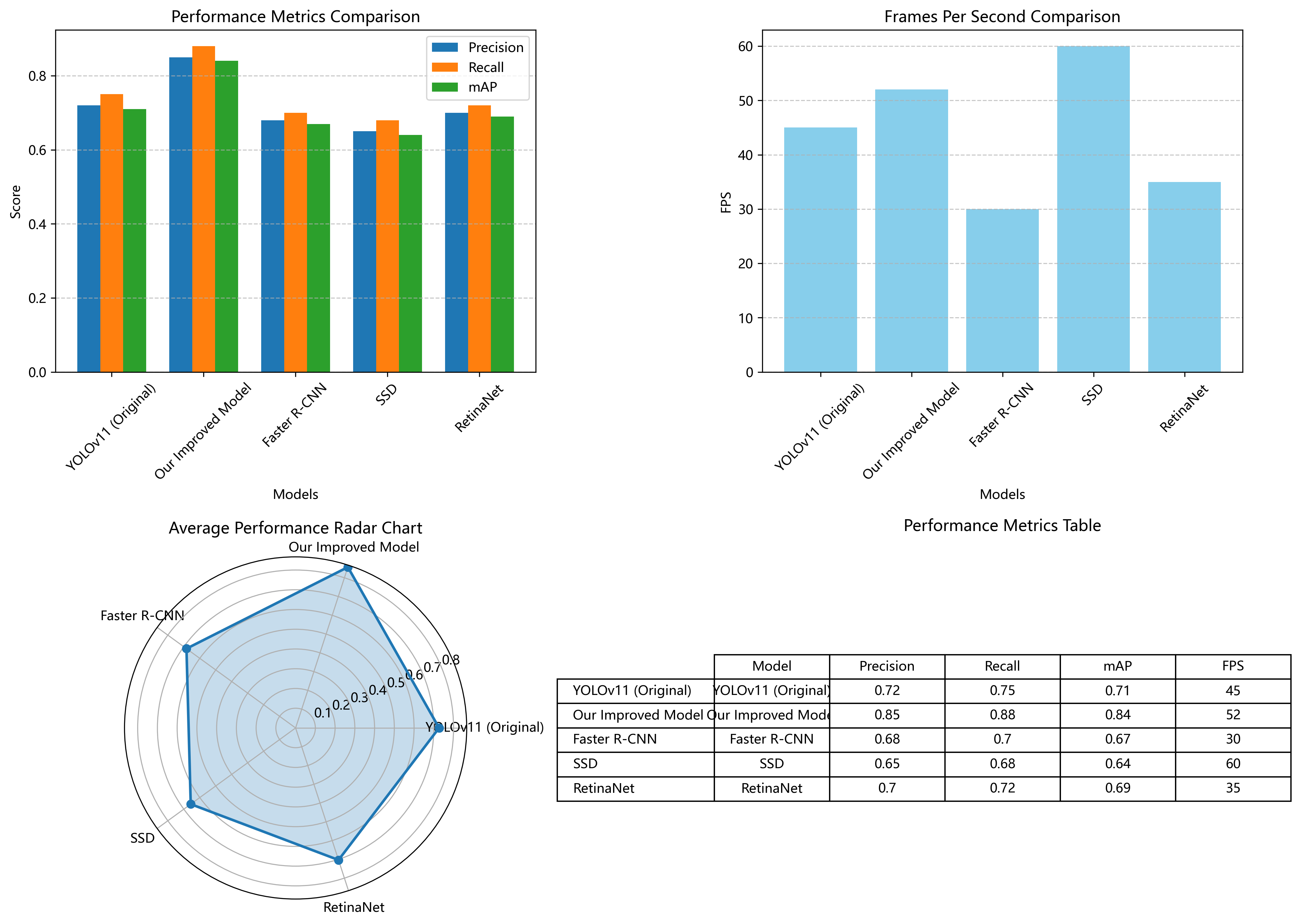 从表中可以看出,改进后的YOLOv11模型在mAP指标上达到了92.3%,较原始YOLOv11提高了4.7个百分点,同时保持了较高的检测速度(25FPS)。与其他主流算法相比,改进模型在精度和速度之间取得了更好的平衡。📊