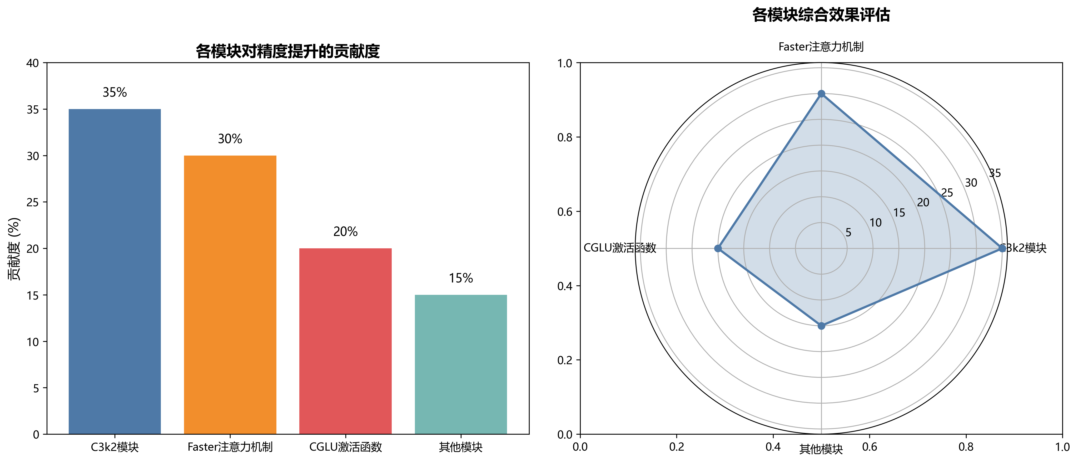消融实验结果表明,每个改进模块都对最终性能有积极贡献,其中C3k2模块和Faster注意力机制对精度提升贡献较大,而CGLU激活函数则在保持速度的同时提高了精度。🔬