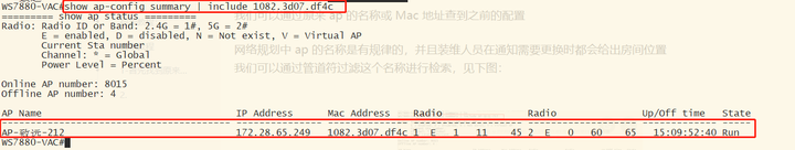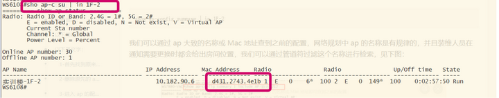 我们可以通过 ap 大致的名称或 Mac 地址查到之前的配置,网络规划中 ap 的名称是有规律的,并且装维人员在通知需要更换时都会给出房间位置,我们可以通过管道符过滤这个名称进行检索,见下图: