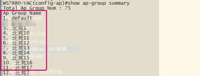 列出所有创建的 AP 的配置摘要,可用"|"管道符过滤内容