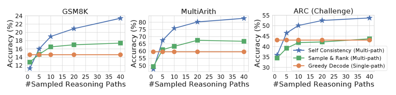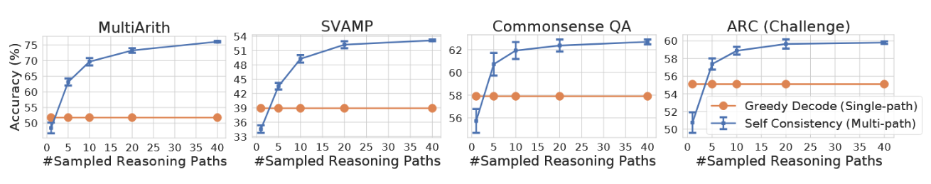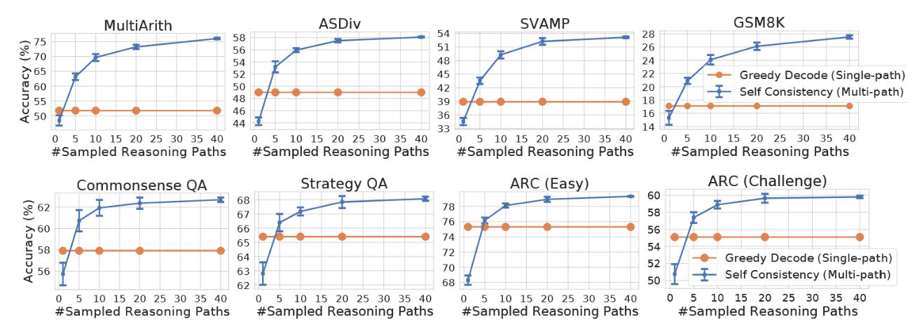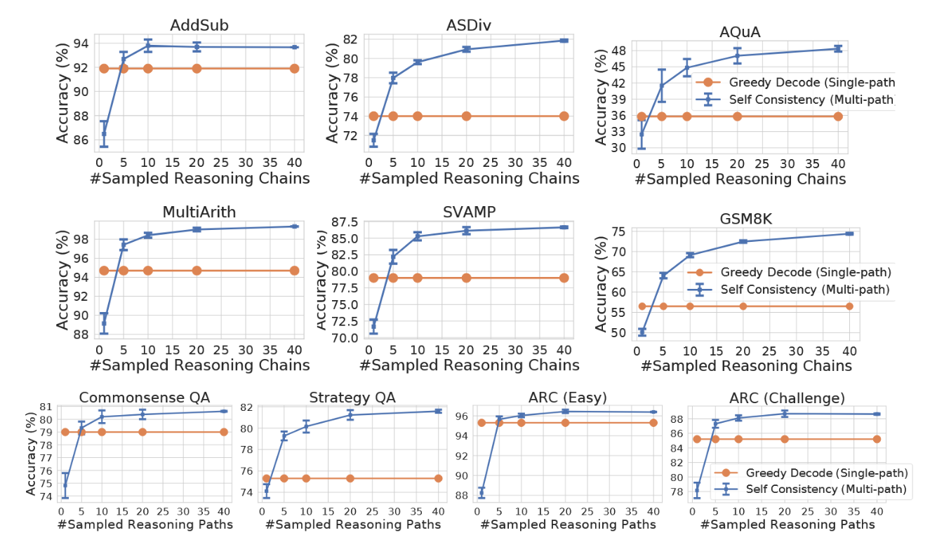 图2:与LaMDA-137B模型上使用贪婪解码的思维链提示(橙色)相比,自洽性方法(蓝色)在算术和常识推理任务中的准确性均有显著提升。采样更多样化的推理路径能持续提高推理准确率。