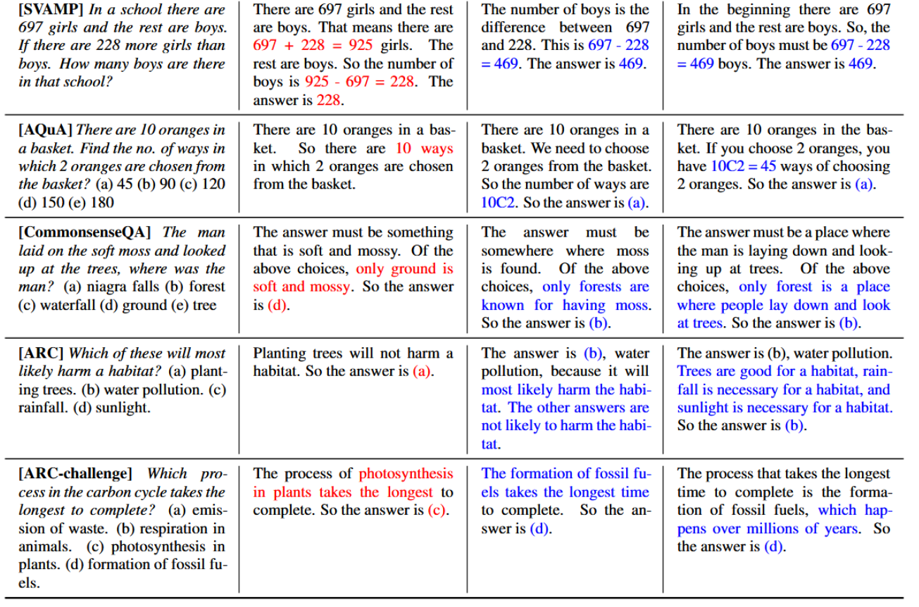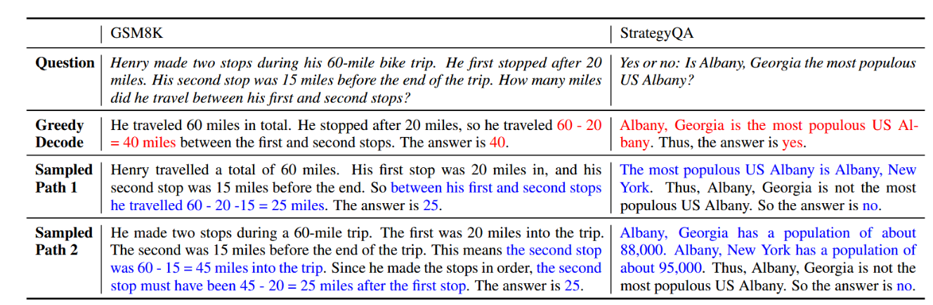 表4:在PaLM-540B模型中,自洽性有助于修正贪婪解码错误的示例。此处展示了与真实答案一致的两条抽样推理路径。