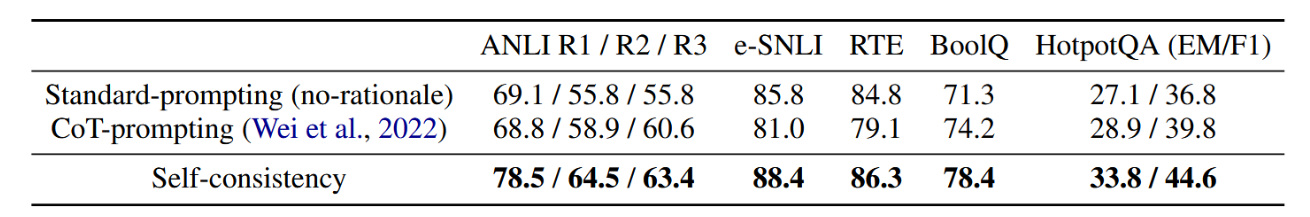 Ye 和 Durrett(2022)的研究表明,在少样本上下文学习中,与标准提示法相比,思维链提示法有时反而会损害模型表现。为此,我们开展了一项研究,利用自我一致性方法,考察其是否能在一系列常见自然语言处理任务中弥补这一不足。这些任务包括:(1)闭卷问答:BoolQ(Clark 等人,2019)、HotpotQA(Yang 等人,2018);(2)自然语言推理:e-SNLI(Camburu 等人,2018)、ANLI(Nie 等人,2020)以及 RTE(Dagan 等人,2005;Bar-Haim 等人,2006;Giampiccolo 等人,2007;Bentivogli 等人,2009)。