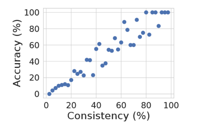 此外,我们发现一致性(以解码结果与最终聚合答案相符的百分比衡量)与准确性高度相关(如图5基于GSM8K数据集所示)。这表明可以利用自洽性来为模型生成的解决方案提供不确定性估计。换言之,可将较低的一致性视为模型置信度不足的指标;即自洽性使模型具备一定能力以"知晓其未知之处"。