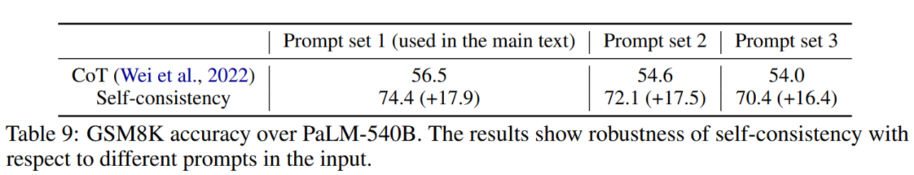 表9:PaLM-540B模型在GSM8K数据集上的准确率。结果表明,自洽方法对于输入中的不同提示具有鲁棒性。