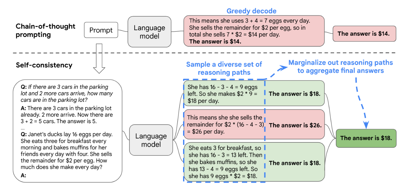 具体而言,假设生成的答案 a i a_i ai来自固定答案集合A,其中 i = 1 , ... , m i=1,...,m i=1,...,m表示从解码器中采样的m个候选输出的索引。给定提示和问题后,自洽性方法引入了一个额外的潜变量 r i r_i ri,它是代表第i个输出中推理路径的标记序列,并将 ( r i , a i ) (r_i, a_i) (ri,ai)的生成过程耦合起来,其中 r i → a i r_i → a_i ri→ai,即生成推理路径 r i r_i ri是可选的,仅用于得出最终答案 a i a_i ai。以图1中的输出3为例:前几句"她早餐吃了3个鸡蛋...因此她有9个鸡蛋 * 2美元 = 18美元"构成 r i r_i ri,而最后一句"答案是18美元"中解析出的数字18即为 a i a_i ai。在从模型解码器中采样得到多个 ( r i , a i ) (r_i, a_i) (ri,ai)后,自洽性方法通过对 r i r_i ri进行边缘化处理,对 a i a_i ai执行多数投票------即 a r g m a x a ∑ i m = 1 ( a i = a ) arg max_a \sum^m_i=1(a_i = a) argmaxa∑im=1(ai=a),或按我们的定义,从最终答案集合中选取"最一致"的答案。