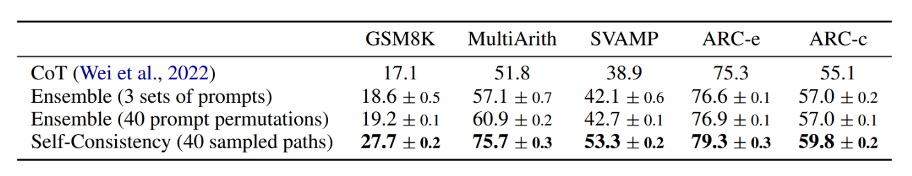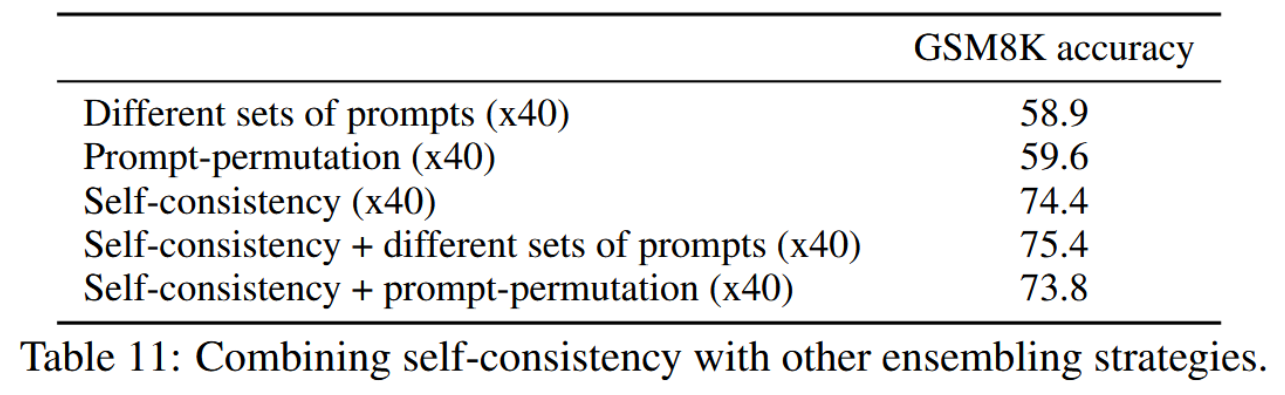 自洽性与其他集成策略完全兼容,尽管自洽性所实现的性能增益显著高于其他集成策略(且能够"覆盖"其他集成策略所带来的性能提升)。我们进一步开展了实验,并将结果呈现在表11中(为公平比较,我们使用40组提示或40种提示排列与采用40条路径的自洽性进行对比,所有实验均基于PaLM540B模型)。