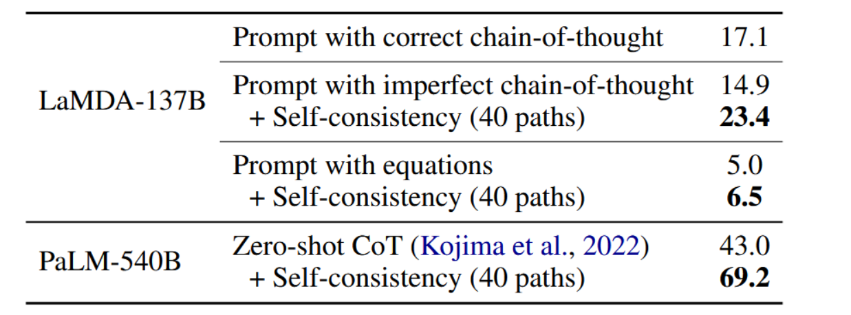 表8:自洽性方法在GSM8K数据集上对于不完善提示、公式提示及零样本思维链的表现。