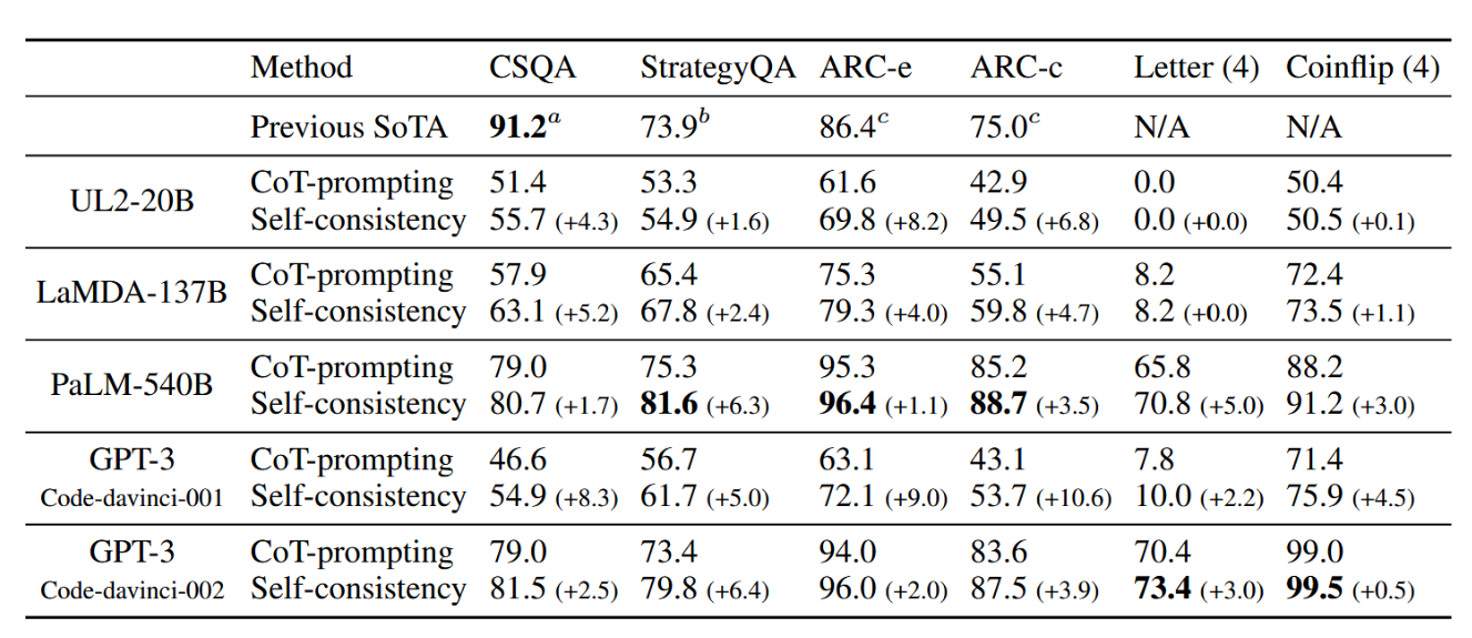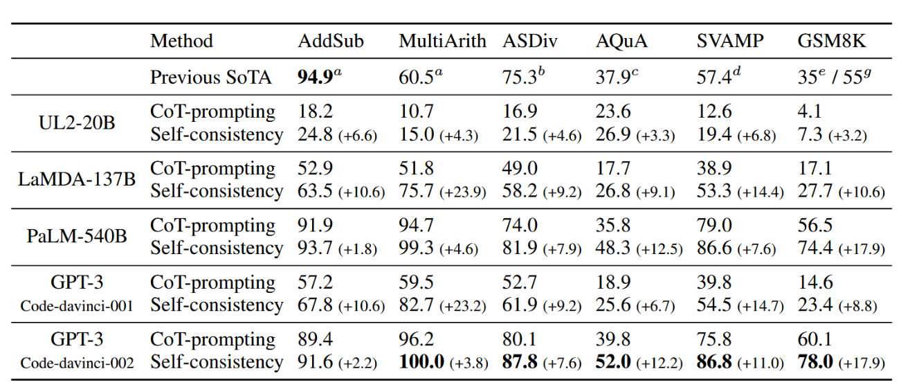 表2:自我一致性与思维链提示的算术推理准确率对比(Wei等人,2022)。先前的最先进基线结果来自:a: 相关性与LCA操作分类器(Roy & Roth, 2015),b: Lan等人(2021),c: Amini等人(2019),d: Pi等人(2022),e: 使用7.5k样本微调的GPT-3 175B(Cobbe等人,2021),g: 微调GPT-3 175B加额外175B验证器(Cobbe等人,2021)。各项任务的最佳性能以粗体显示。