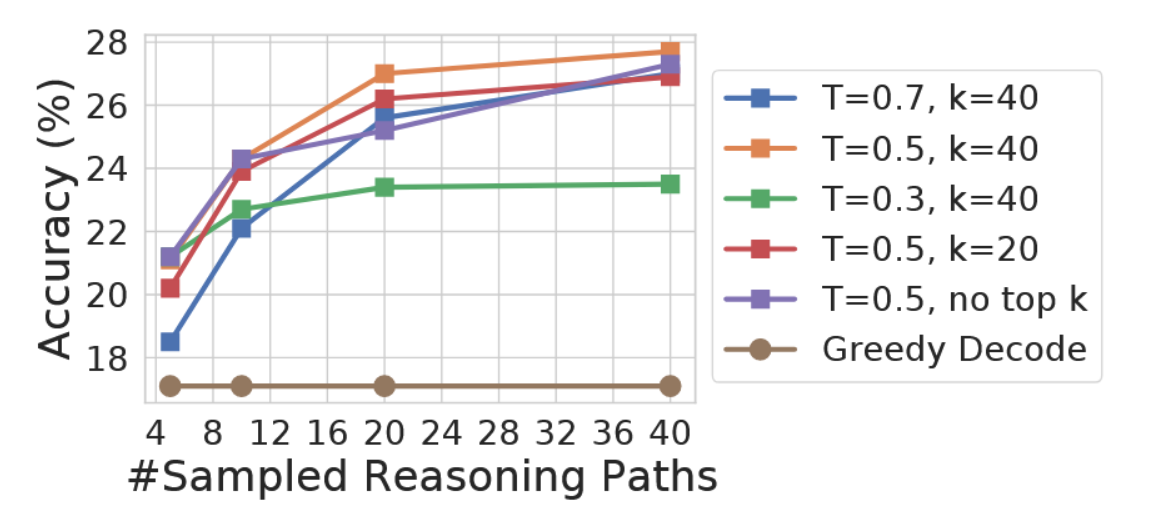 提取推理路径。先前研究提出过多种任务专用方法,如构建语义图(Xu等人,2021a)、训练循环神经网络在维基百科图谱中检索推理路径(Asai等人,2020)、基于数学问题中人工标注的推理路径进行微调(Cobbe等人,2021),或使用启发式伪推理路径训练提取器(Chen等人,2019)。近期研究虽注意到推理过程多样性的重要性,但仅通过任务专用训练加以利用,例如在提取的推理路径上增加问答模型(Chen等人,2019),或在常识知识图谱中引入潜变量(Yu等人,2022)。相比这些方法,自洽性方法更为简洁且无需额外训练。我们提出的方法仅通过解码器采样耦合推理路径生成与最终答案,利用聚合机制获取最一致答案,无需引入额外模块。