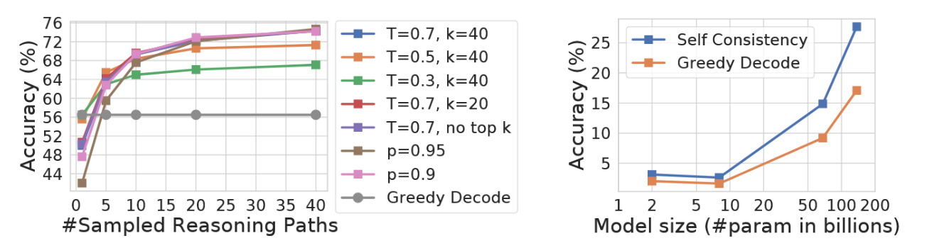 图4:GSM8K准确率。(左)自我一致性对不同采样策略和参数具有鲁棒性。(右)自我一致性提升了不同规模语言模型的性能。