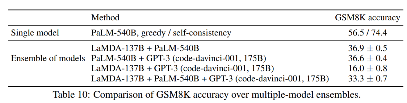 此外,我们提供了对多个语言模型输出进行直接集成(ensemble)的结果。如表10所示,通过对3个语言模型的序列进行贪婪解码(greedy decoding),采用多数投票法(10次运行取平均)。请注意,这是一种典型的集成方法(对多个模型的预测结果进行平均),其性能显著低于自洽方法(PaLM-540B的自洽准确率达到74.4%),因为较低能力的模型会拉高能力模型的整体表现。此外,该方法存在两点局限:1)集成需要多个模型,而这并非总能满足,而自洽方法仅需单一模型即可实现"自我集成";2)若其中一个模型明显较弱,反而可能损害最终性能。