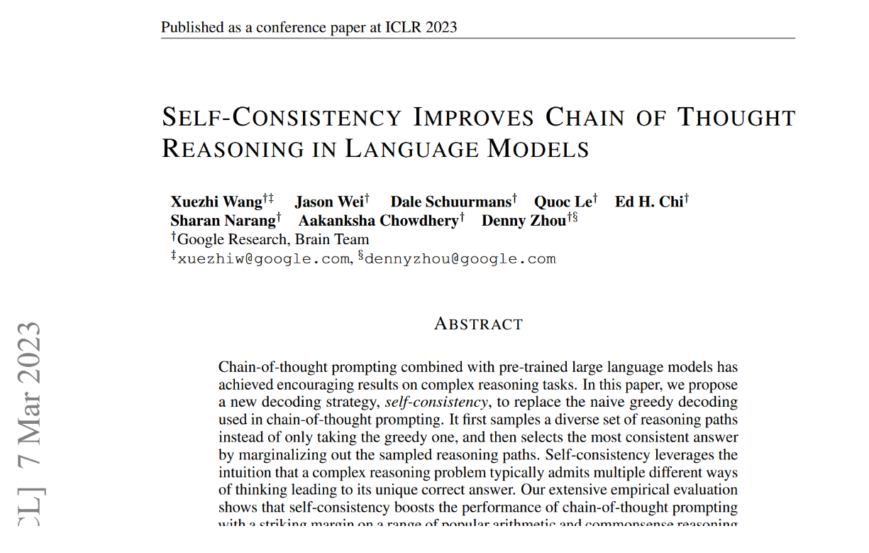 思维链提示与预训练大语言模型结合,在复杂推理任务上取得了令人鼓舞的成果。本文提出一种新的解码策略------自洽性,以取代思维链提示中使用的朴素贪心解码。该方法首先生成多样化的推理路径集合,而非仅采用贪心路径,随后通过边缘化采样得到的推理路径来选取最一致的答案。自洽性基于这样的直观认识:复杂的推理问题通常允许多种不同的思考方式,并最终指向其唯一正确答案。我们广泛的实证评估表明,自洽性显著提升了思维链提示在一系列主流算术与常识推理基准测试上的性能,包括GSM8K(+17.9%)、SVAMP(+11.0%)、AQuA(+12.2%)、StrategyQA(+6.4%)和ARC-challenge(+3.9%)。