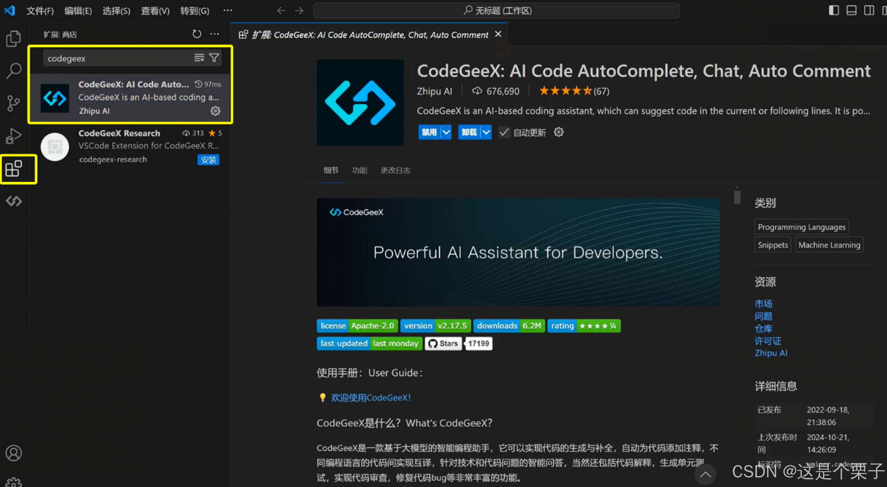 - 找到由 CodeGeeX Team 发布的插件(Logo 是一个蓝色的几何体)。