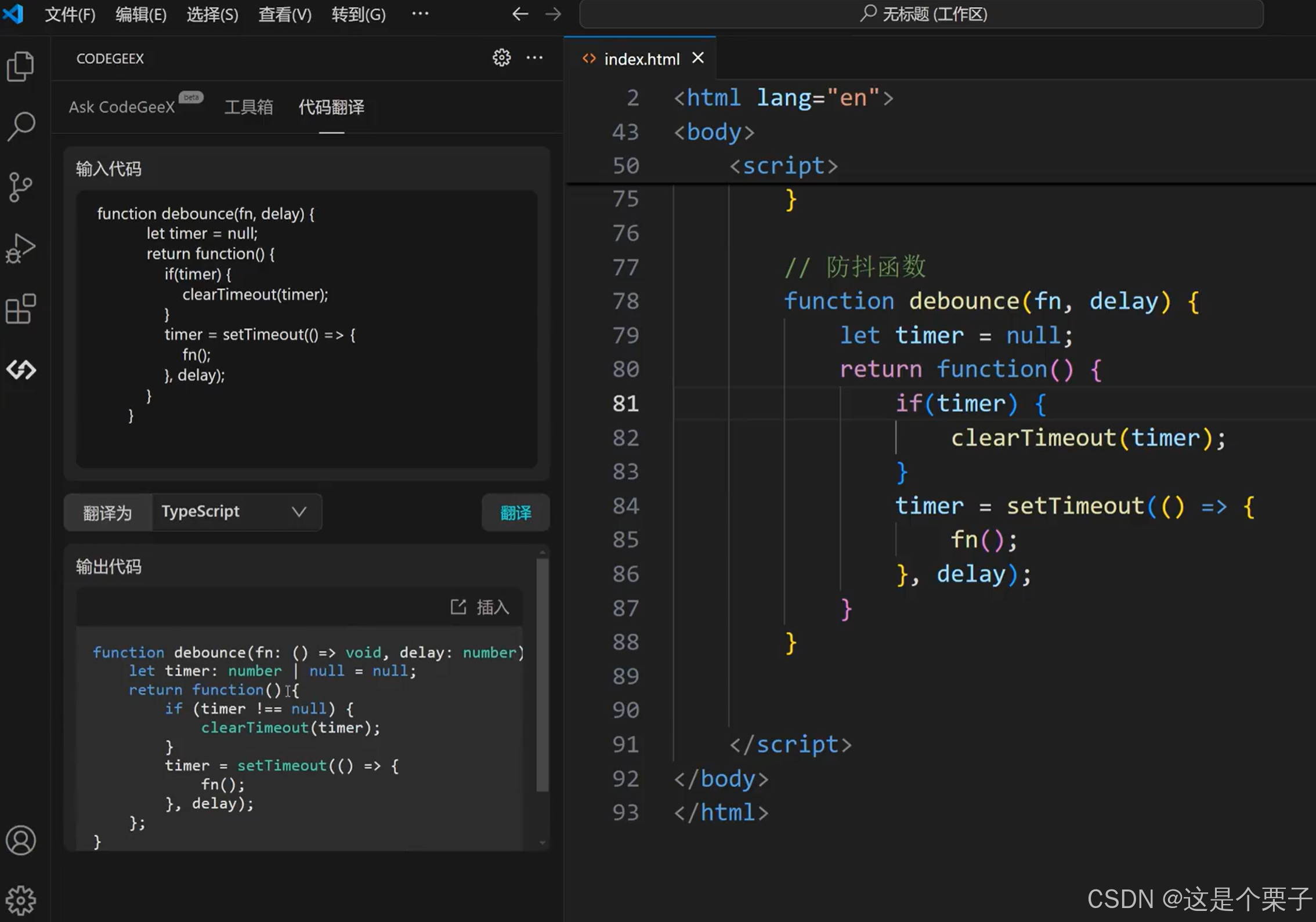前端技术栈迭代极快,从 jQuery 迁移到 React,或者从 JavaScript 重构为 TypeScript,往往伴随着巨大的"搬砖"工作量。CodeGeeX 的代码翻译功能是其一大亮点。