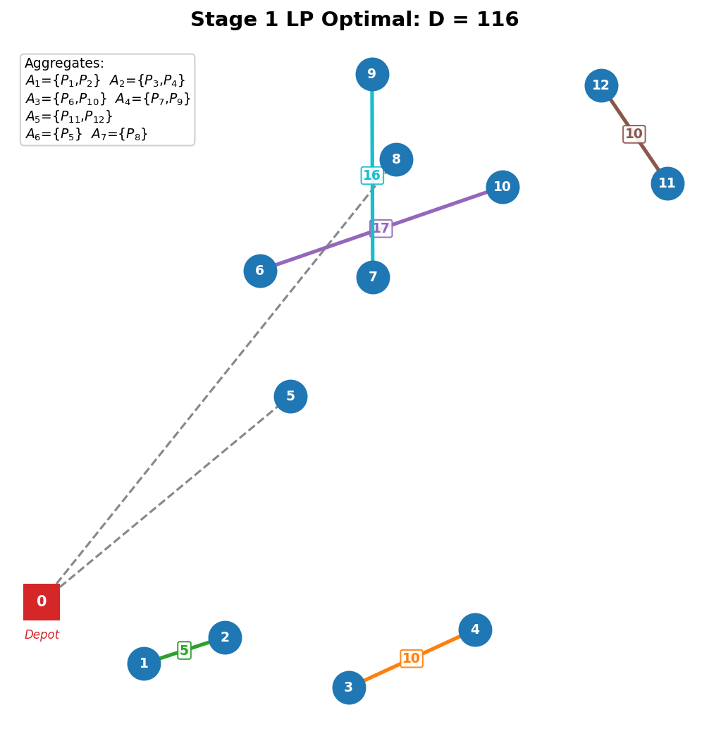 Dantzig 和 Ramser 的算法思路简洁------把站点逐层两两绑定:每一层求解一个匹配 LP,把节点配对捆绑成更大的组,绑定后不可拆,交给下一层继续合并。