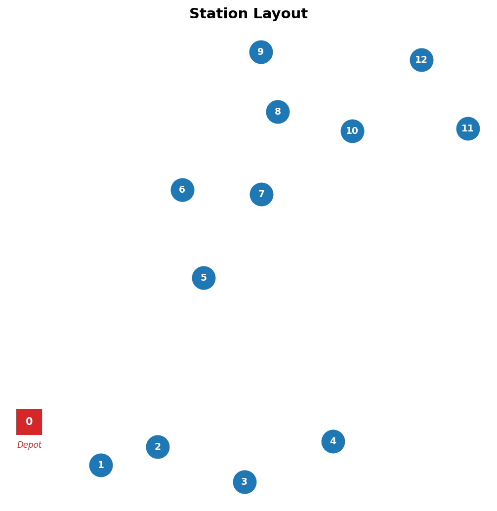 - N = { 1 , 2 , ... , 12 } \mathcal{N} = \{1, 2, \ldots, 12\} N={1,2,...,12}:站点集合