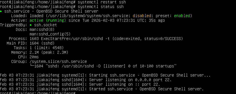 重启后,可通过以下命令确认 SSH 服务状态: