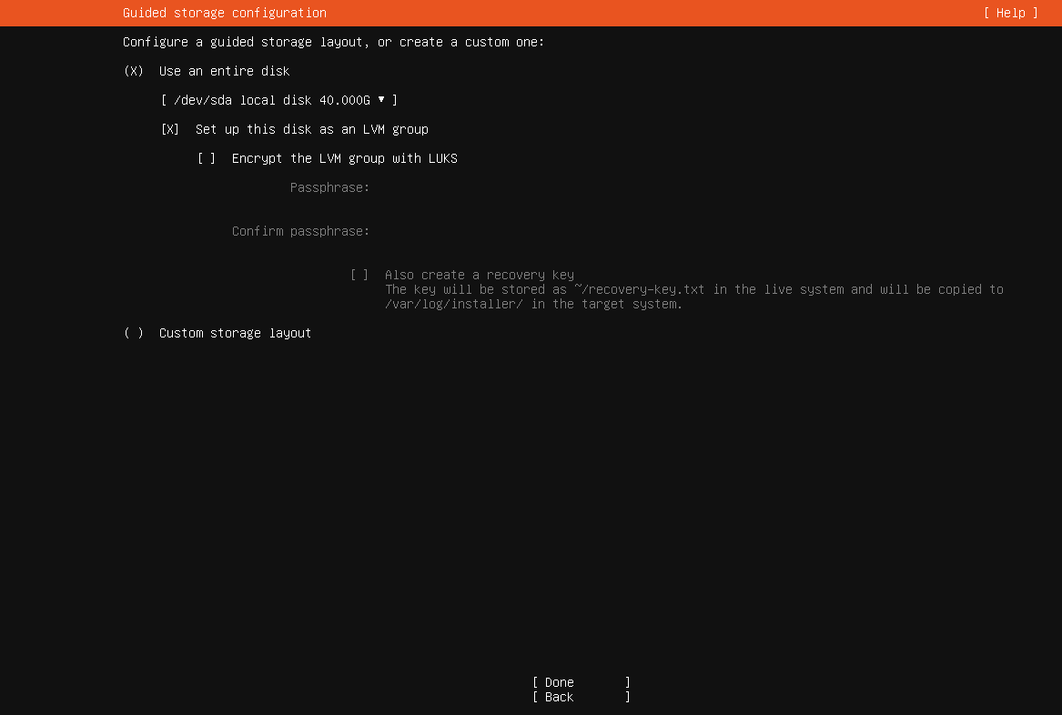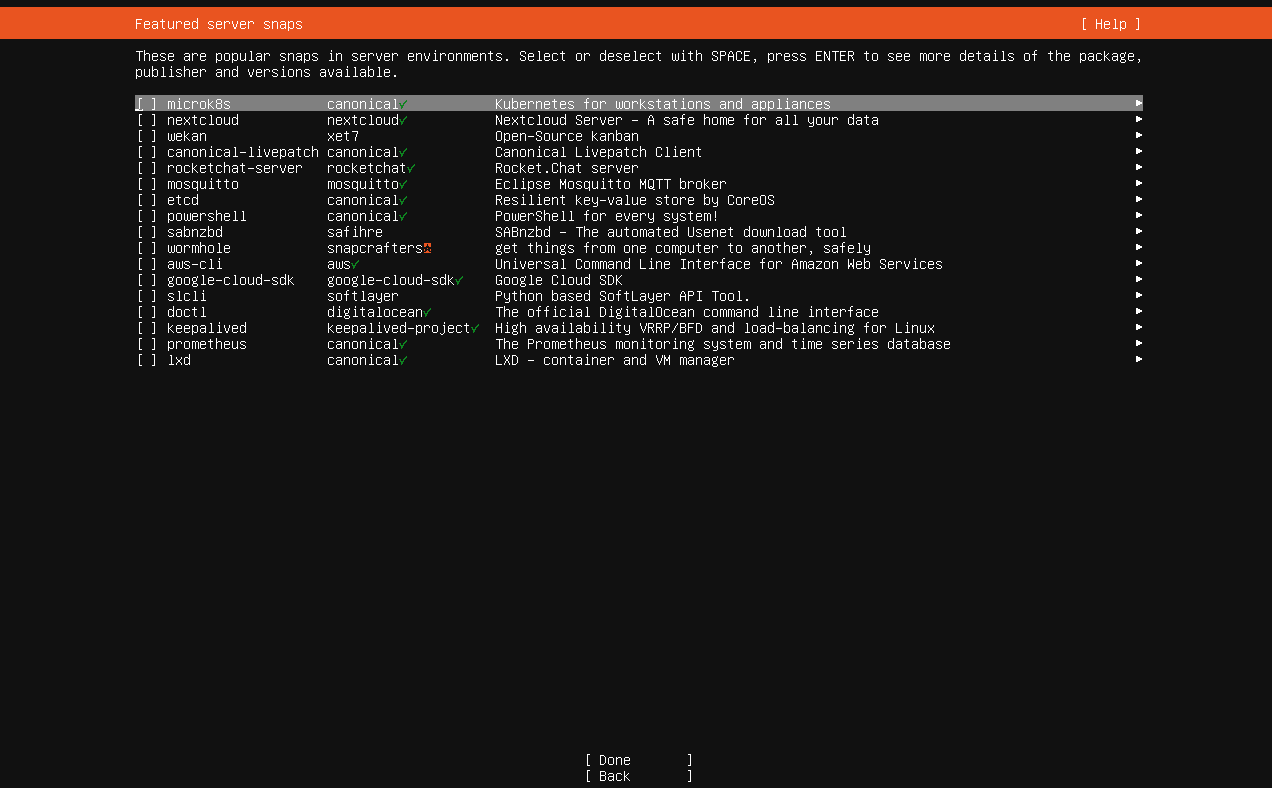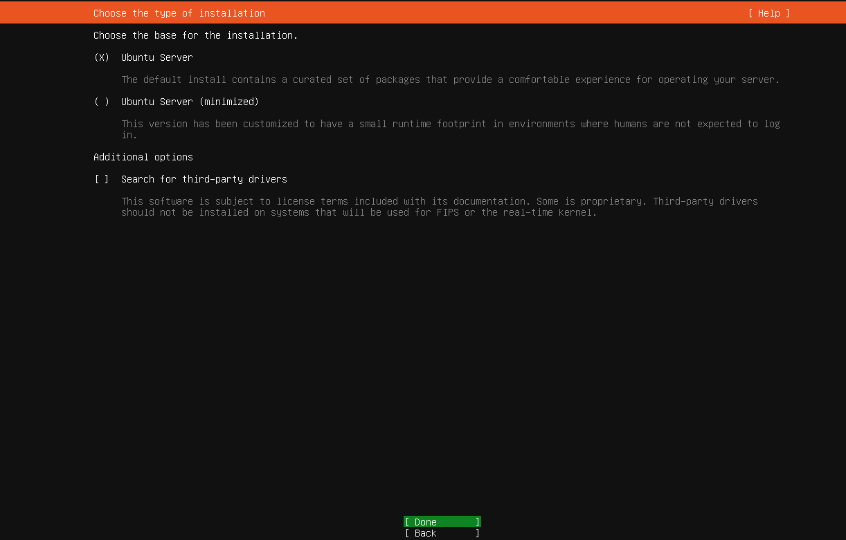 选择安装类型,默认 Ubuntu Server,选中"Done"并回车确认: