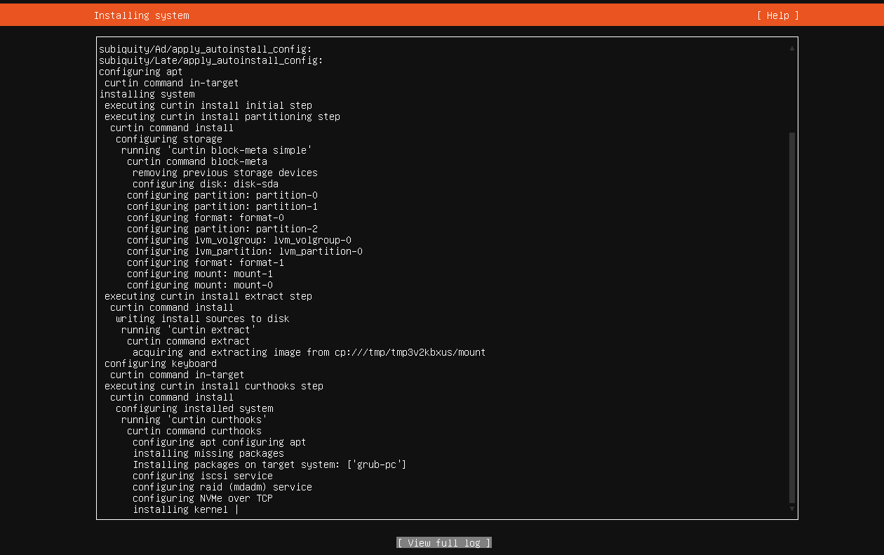 配置完成,正式开始安装系统。根据网络情况,如果网络一般的情况下软件包下载可能需时较长,可选中"View full log"并回车查看完整的系统安装日志: