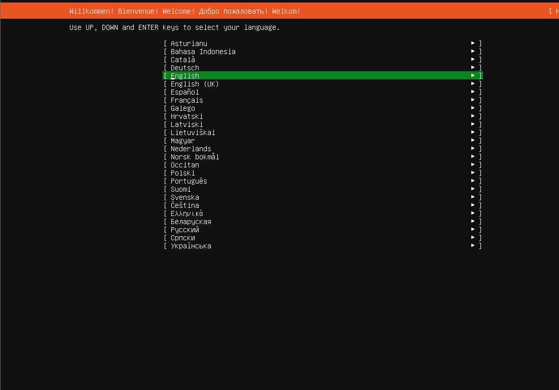 稍等待进入如下安装欢迎界面后,键盘上下键选择安装过程中想使用的语言,这里选择默认的"English",直接回车确认: