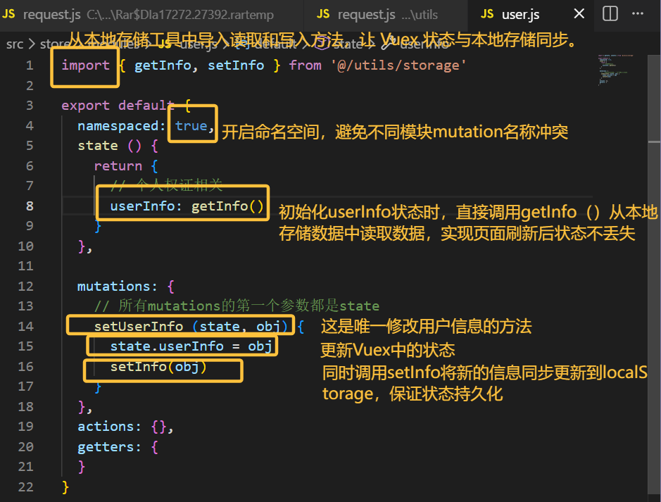 初始化:应用启动时,user 模块的 state 会通过 getInfo() 从 localStorage 读取用户信息(如 token),自动登录。 更新:登录成功后,调用 this.store.commit('user/setUserInfo', userData),Vuex 状态和本地存储会同时更新。 退出:调用 this.store.commit('user/setUserInfo', { token: '', userId: '' }) 或直接调用 removeInfo(),清除状态和本地存储