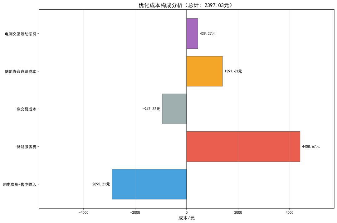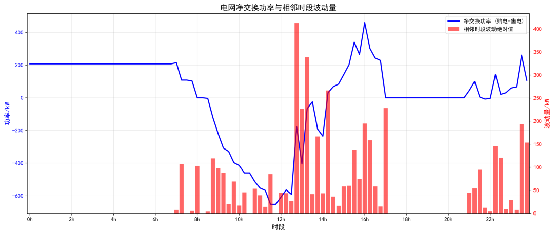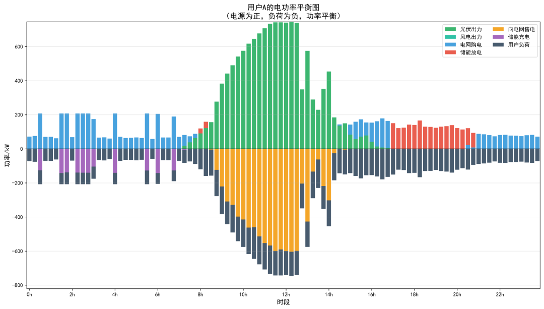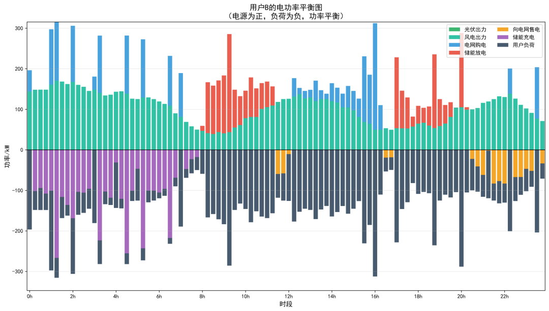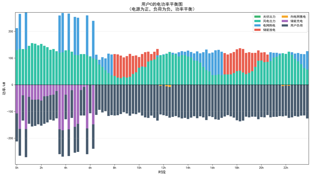 本模型在传统共享储能优化配置与调度模型的基础上,创新性地引入了碳交易机制和电网交互功率波动惩罚机制,具有以下特点和优势:(1)多目标协同优化。本模型实现了经济效益、环境效益与电网友好性的多目标协同优化。通过合理设置各成本项的权重系数,可以在不同优化目标之间进行权衡,满足不同场景下的决策需求。(2)碳交易机制创新。碳交易机制的引入使得模型能够量化用户群的碳排放成本,激励用户减少从电网购电、增加可再生能源消纳和储能利用。该机制与国家"双碳"战略目标高度契合,为共享储能电站的低碳运营提供了有效的经济激励手段。通过碳交易价格的调节,可以引导用户行为向低碳方向转变,实现环境效益与经济效益的双赢。(3)电网友好性设计。电网交互功率波动惩罚机制的引入有效抑制了用户群与电网交互功率的剧烈波动,提高了系统的电网友好性。考虑了大规模分布式资源接入对电网运行的影响,通过经济手段引导用户群的用电行为更加平滑有序,有利于减轻电网调峰调频压力,提高电力系统的运行稳定性。这对于促进分布式能源的大规模消纳具有重要的现实意义。(4)线性化建模技术。采用 Big-M 法和辅助变量法等线性化技术,将原本非线性的约束条件转化为线性约束,使得模型可以采用成熟的混合整数线性规划(MILP)求解器进行高效求解。保证了模型的计算效率,又确保了优化结果的全局最优性,为模型的实际应用奠定了坚实的理论基础。