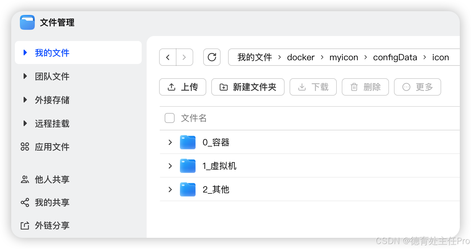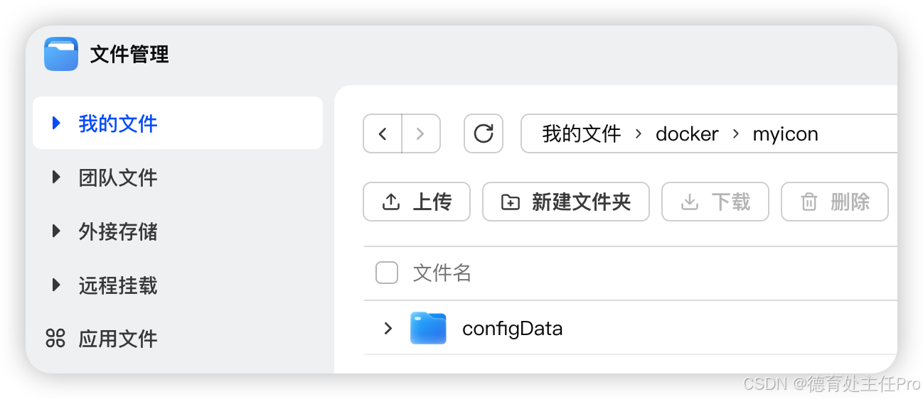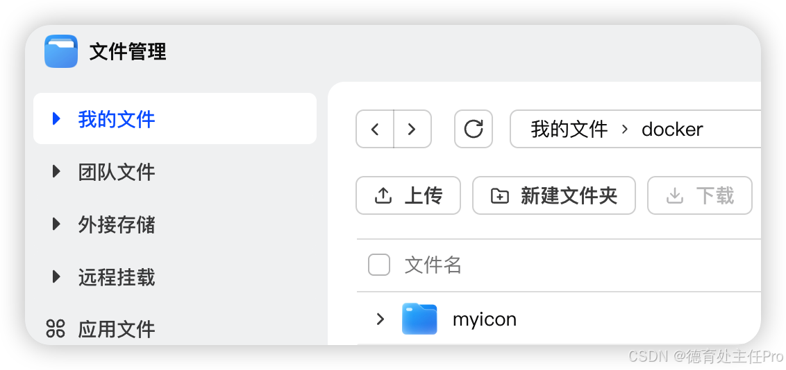 打开"文件管理",找到"docker"文件夹,在其下创建一个"myicon"文件夹。