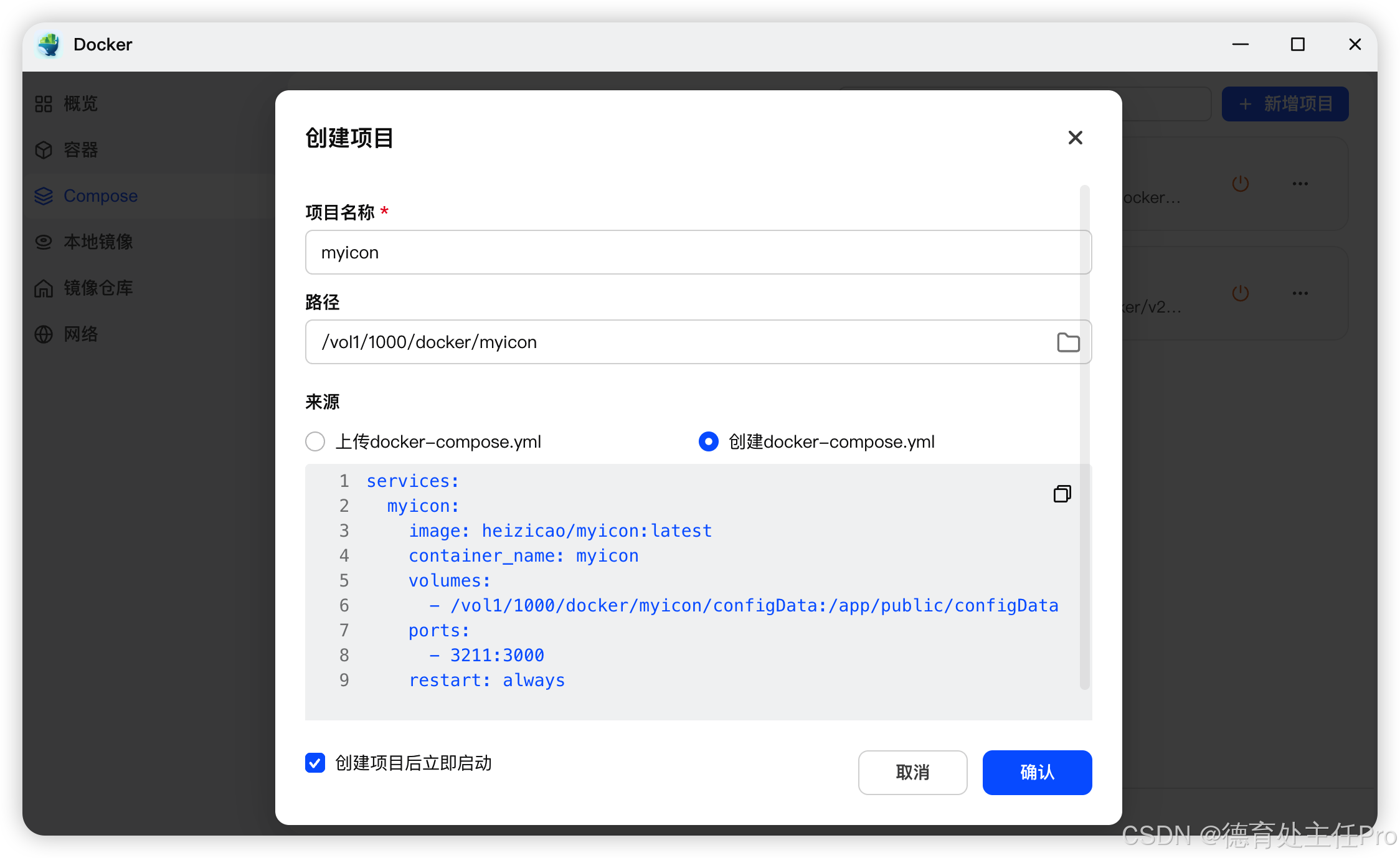 打开"Docker"文件夹,在"Compose"里新增一个项目,配置如下图所示。