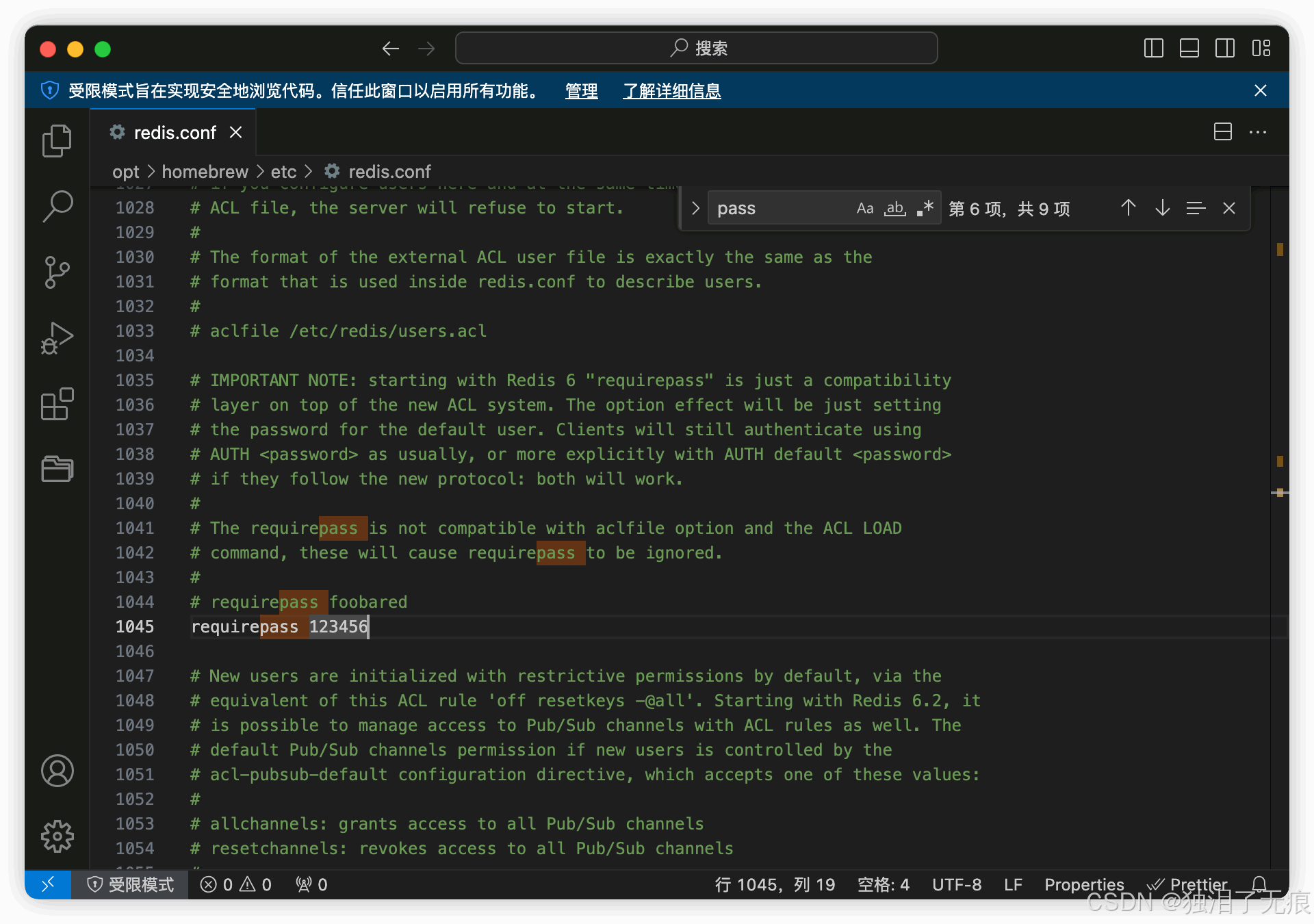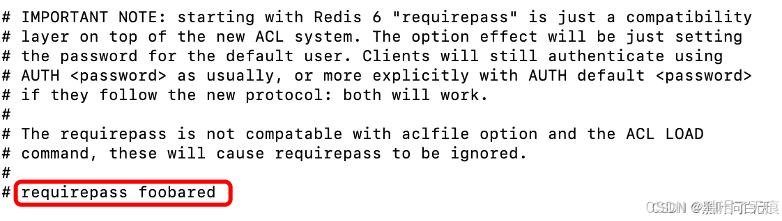 找到 requirepass 关键字,后面跟的就是密码,如下图所示。