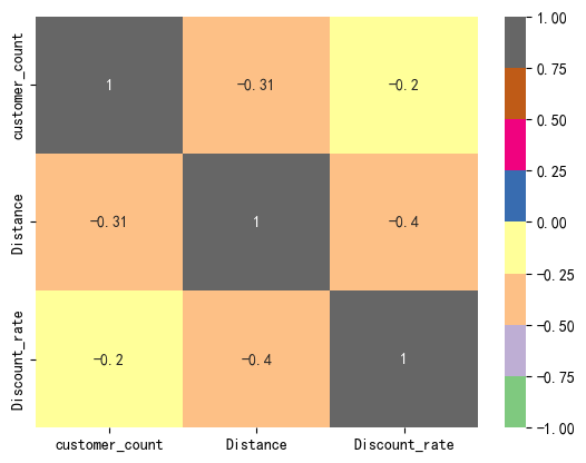 sns.heatmap(data=merchant_pop_dis_rate.corr(),annot=True,cmap='Accent',vmax=1,vmin=-1)