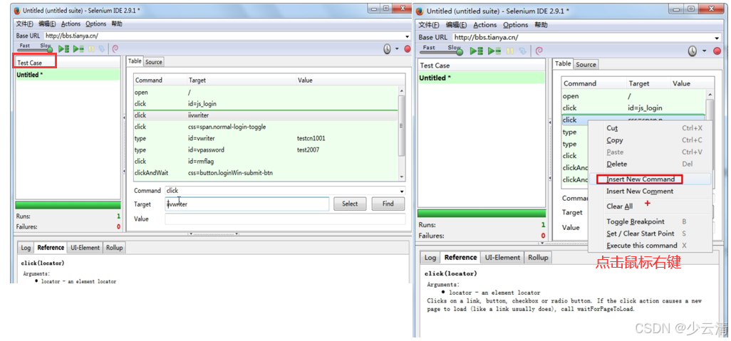 录制脚本时候是录制鼠标和键盘的所有在浏览器操作,那么脚本会出现多余的步骤,有时候我们需要手动填写脚本或修改脚本,所有我们有必要对Selenium IDE脚本编辑与操作有所了解;