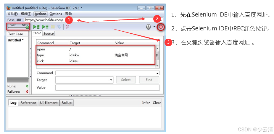 需求:使用Selenium IDE插件录制--->打开百度搜索引擎,搜索框输入[淘宝官网],点击[百度一下] 按钮。