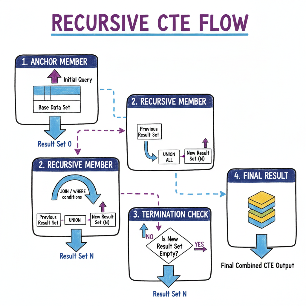 递归 CTE 流程图:展示从锚点成员到递归成员再到终止条件的完整流程