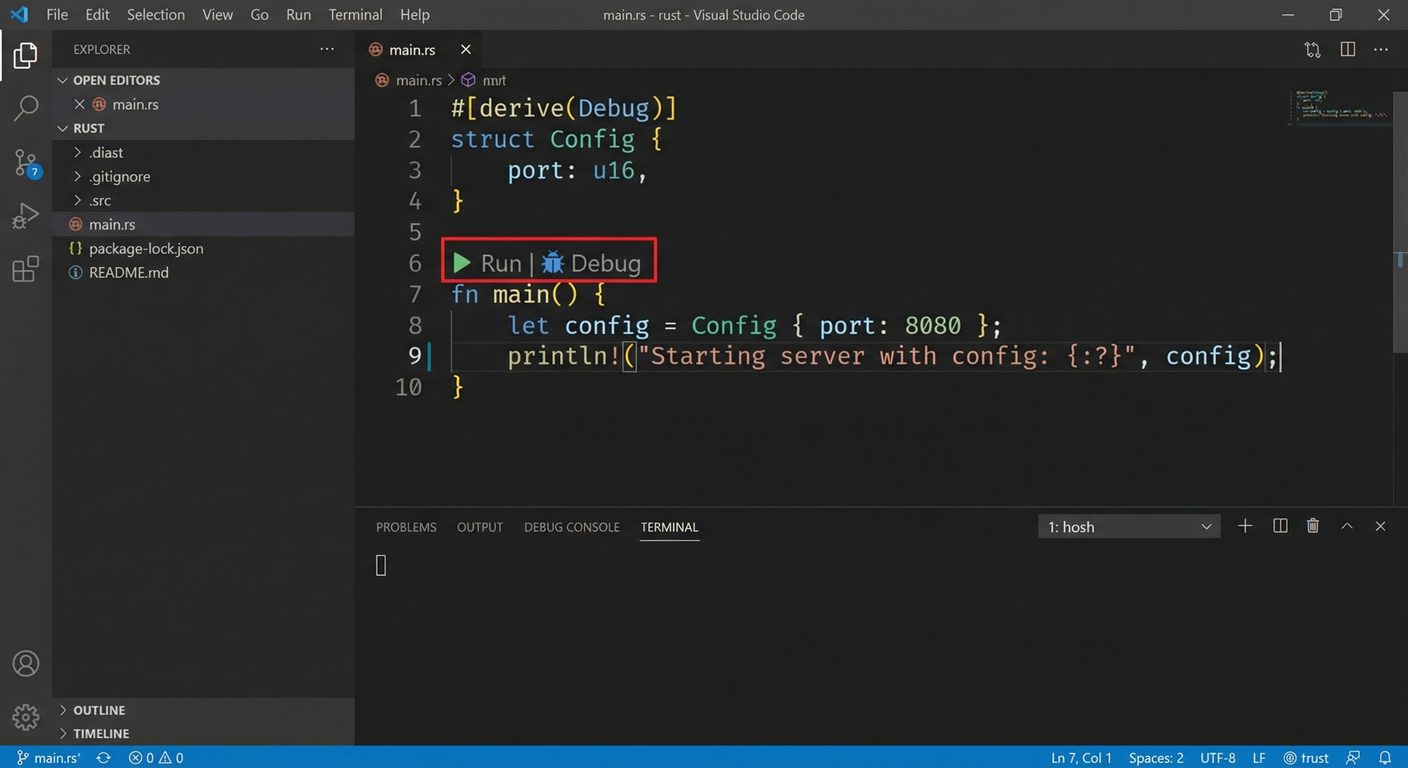 main()上方的 Debug CodeLens,或按Ctrl+Shift+P运行 Rust Analyzer: Debug