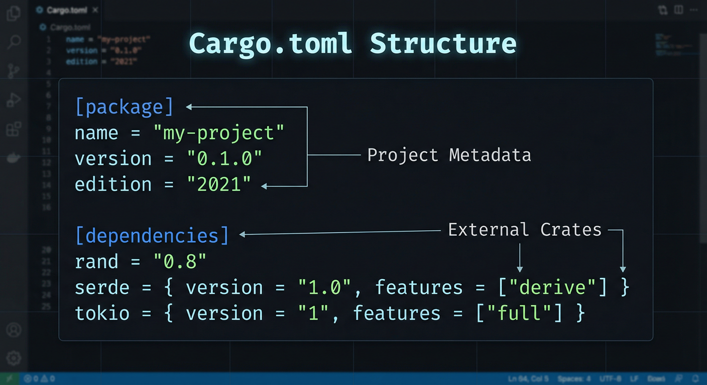 每个 Cargo 项目的根目录都有一个 Cargo.toml,使用 TOML 格式,定义项目元信息和依赖。