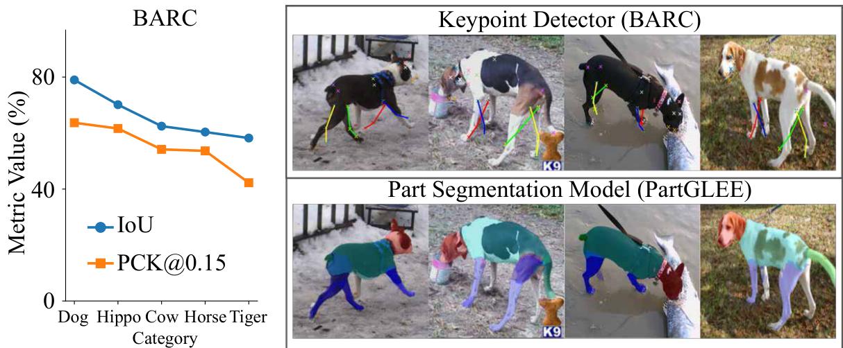 问题是:动物 keypoint detector 并不稳。论文在 Introduction 做了一个很具体的核查:用 Animal3D 的人工标注,评估 BARC 的 keypoint detector,发现不同类别表现不一致,腿部等细长结构容易出现系统性偏差;并在可视化中对比了 PartGLEE 的 part segmentation,强调"通用 2D 模型的密集输出"可能更可靠。