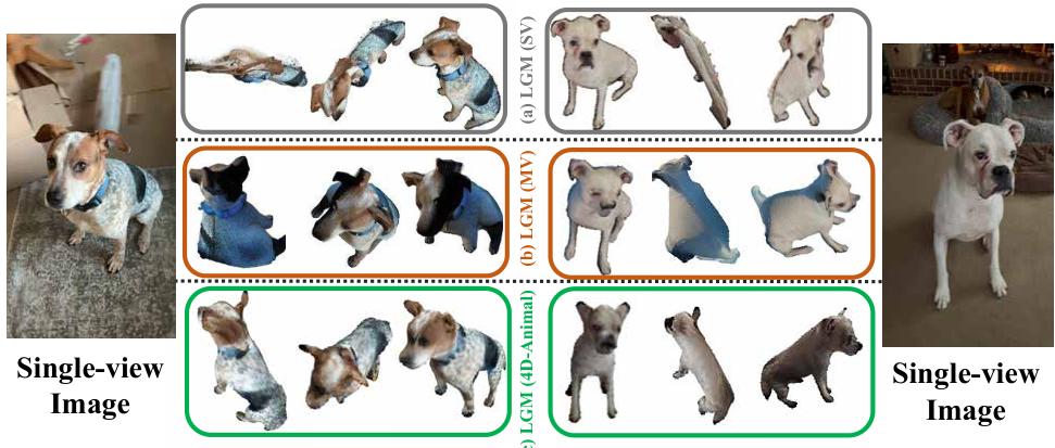 论文在 RQ4 讨论一个很现实的下游:image-to-3D generation。它观察到许多 3D 生成模型在 Objaverse 等 synthetic 数据上训练后,面对真实动物图像会出现明显 domain gap(例如 LGM 在单视图输入下可能退化为"扁平结构",多视图扩增也难保持一致性);而用 4D-Animal 重建出的 3D 资产去 fine-tune,有机会缩小 sim-to-real gap,让未见过的单张动物图也生成更合理的 3D。