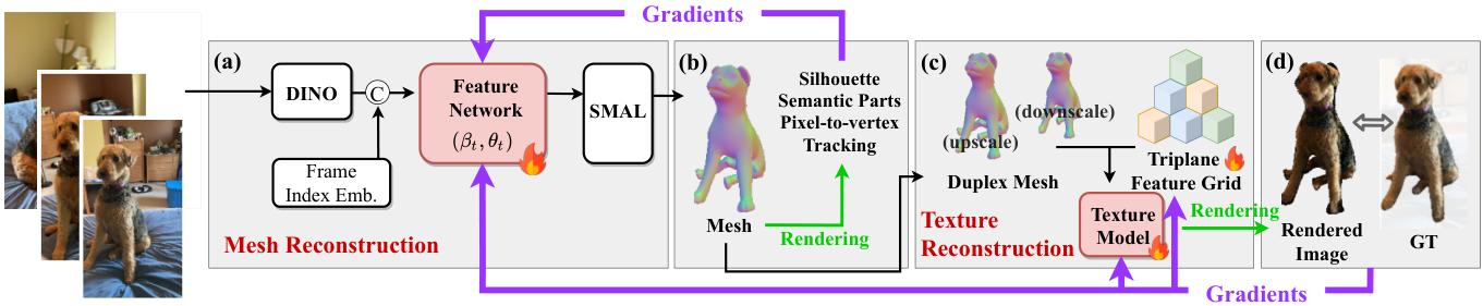 - Mesh reconstruction:回归并优化每帧 SMAL 参数;