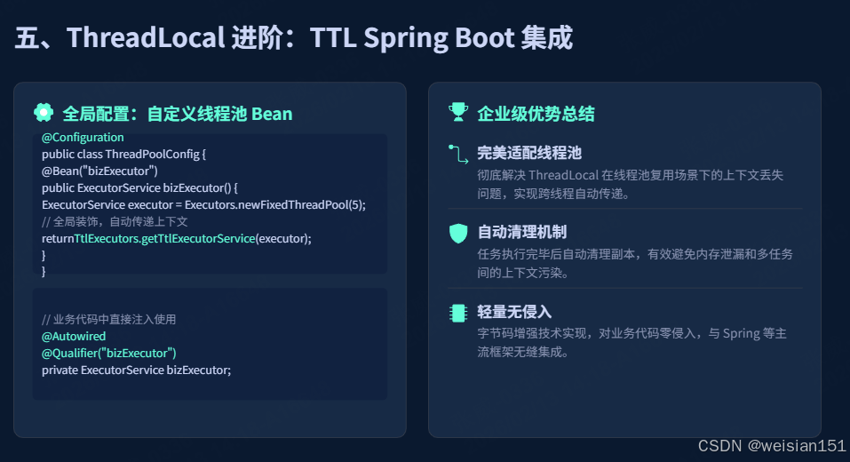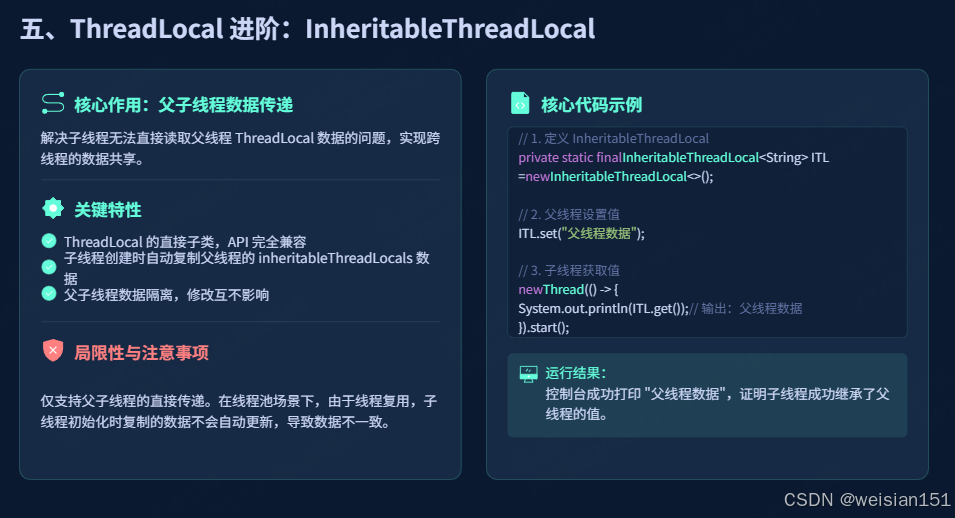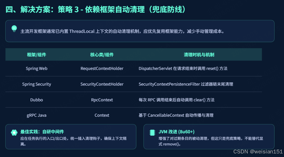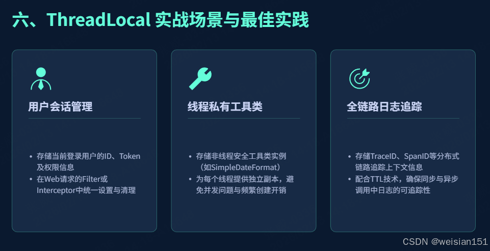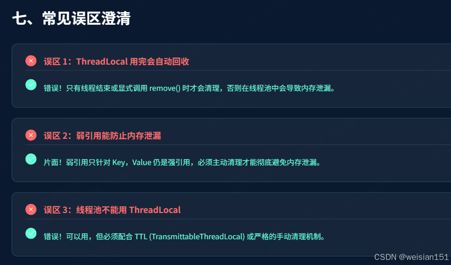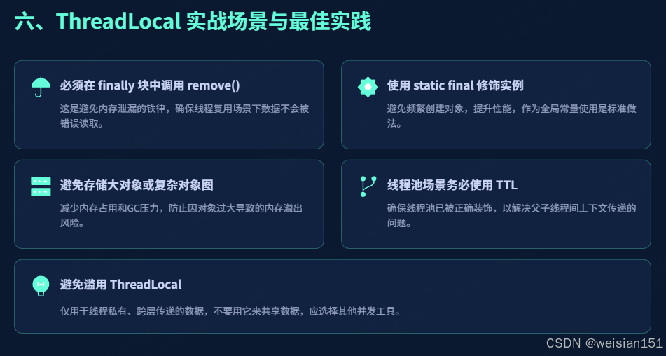 remove(),极易造成内存泄漏,务必严格遵守「使用完毕即清理」的原则。 - 避免滥用 ThreadLocal :ThreadLocal 适用于「线程私有、跨层传递、无需共享」的数据存储,若数据需要在多个线程之间共享,应使用锁或并发集合(如