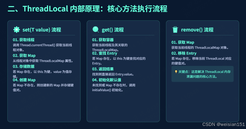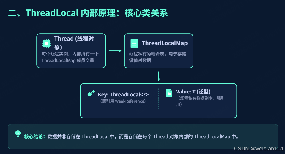 从底层实现来看,它并非存储数据的容器,而是一个「数据访问入口」,真正的数据存储在每个线程独立的 ThreadLocalMap 中;从实战角度来看,它简化了线程私有数据的跨层传递,提升了代码的可读性和开发效率,但也存在内存泄漏的隐患,需要严格遵守「使用完毕即清理」的原则。