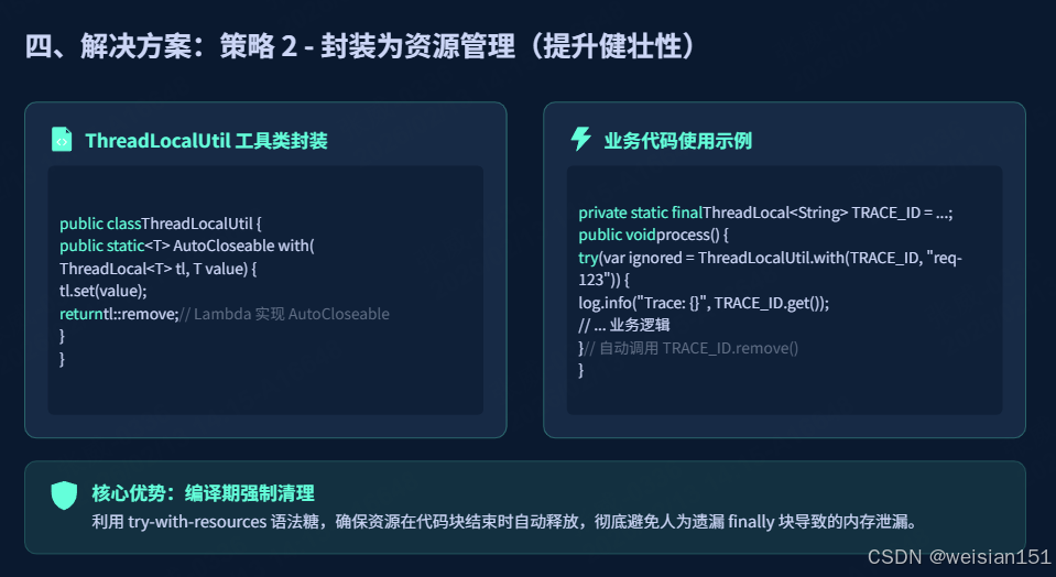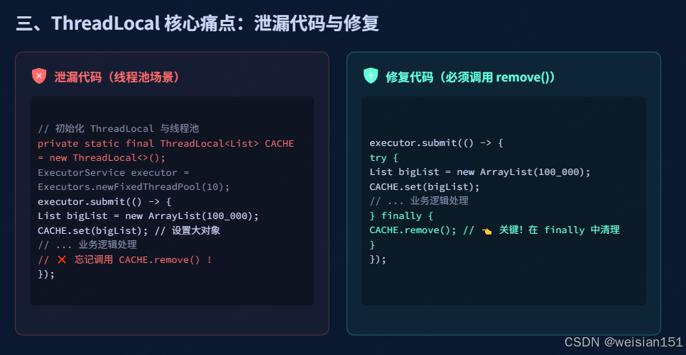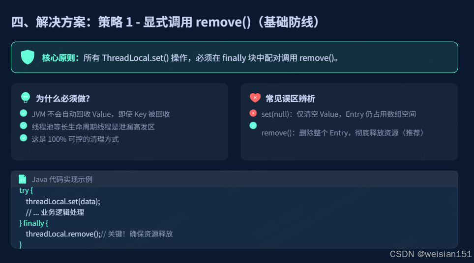 - 必用 finally 块调用 remove() :这是避免内存泄漏的核心,无论业务逻辑是否抛出异常,都应在