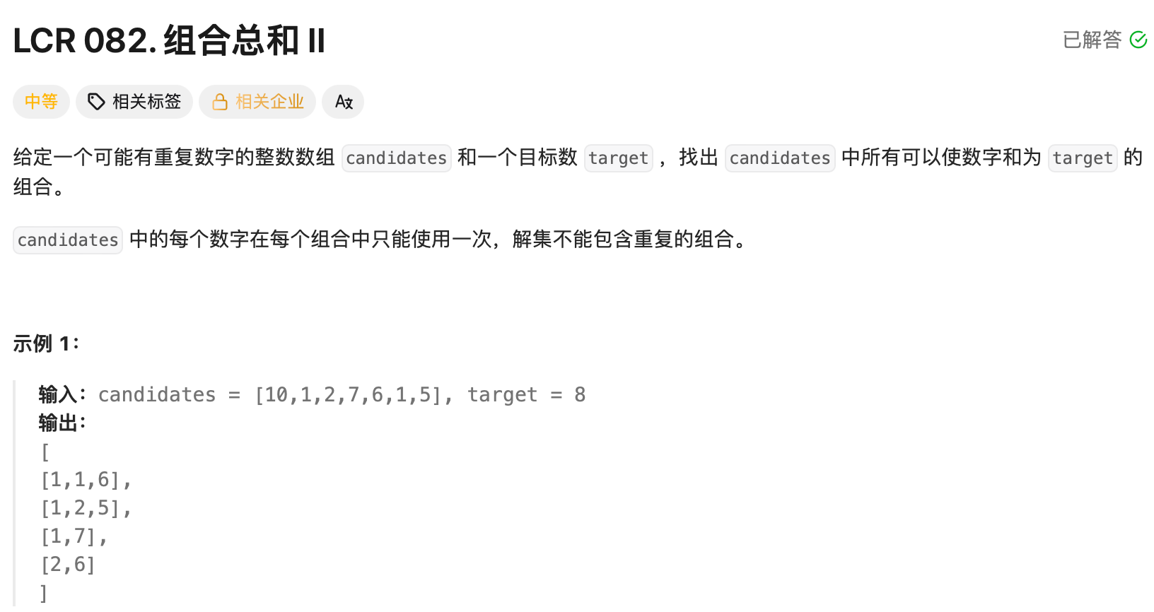 以上面的例子来说面,排序后candidates = [1,1,2,5,6,7,10]。按照我们上面所叙述的【for i in range(n)表示的是以inputs中的每一个num为起始,去枚举所有的lists.】,由于有两个1,其实在枚举以第一个1为开始的所有lists的时候已经包括了所有的可能,所以就不用再去列举以第二个1为起始的所有lists。