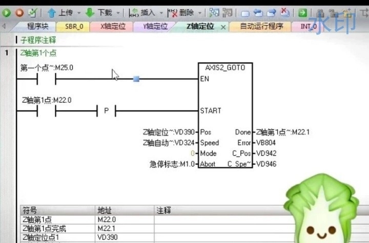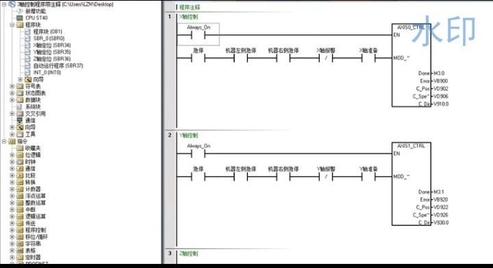 这里用了直接输出脉冲的方式,注意要串联限位信号做互锁。实际调试中发现,方向信号Q0.1的电平状态得和机械实际运动方向对应,有时候需要反向就改这里。
