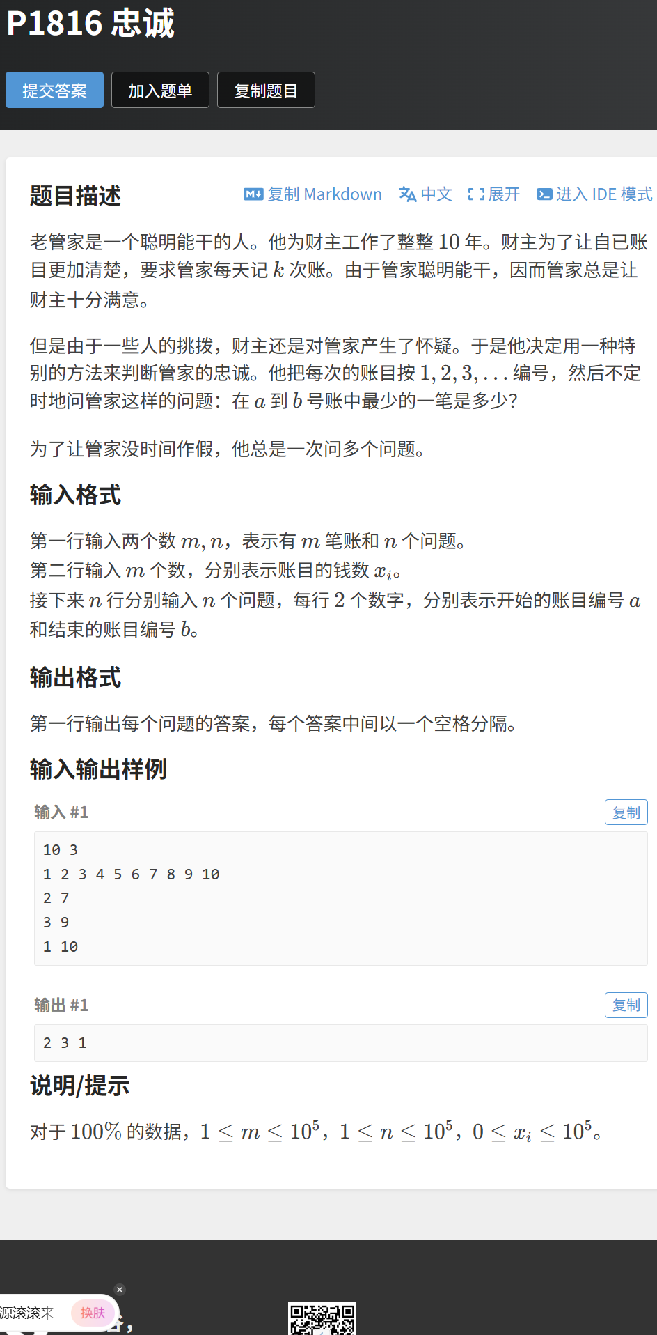 2.1 例题:忠诚(洛谷 P1816)