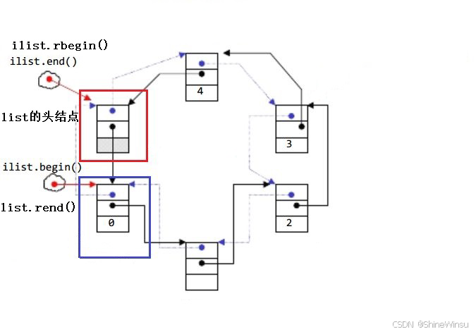 begin():返回指向第一个有效节点(节点 1)的迭代器;end():返回指向哨兵尾节点的迭代器(尾后迭代器,不指向有效元素);- 空链表时,哨兵头节点的