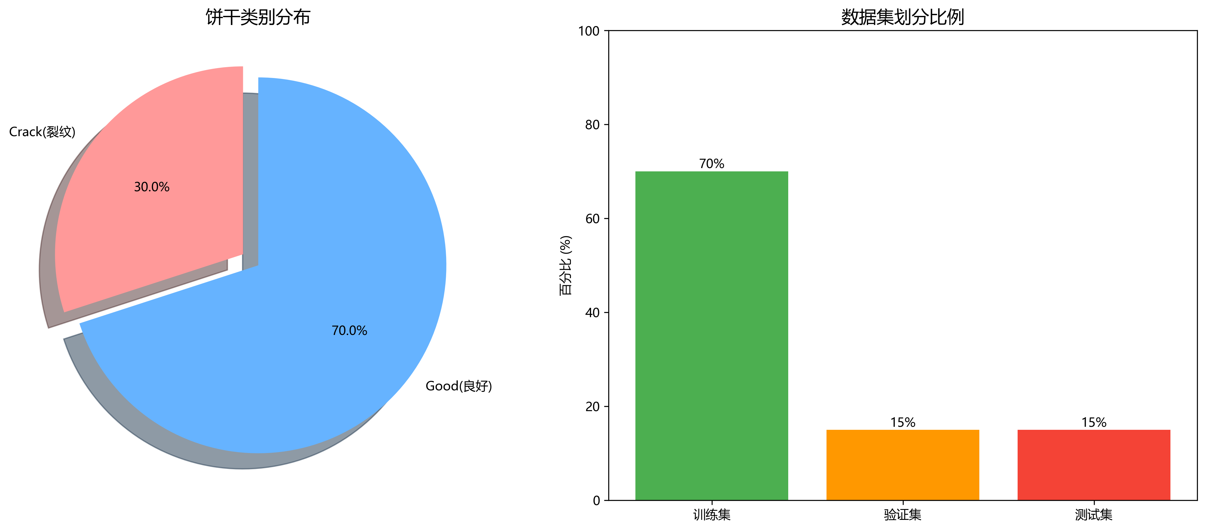 我们构建了一个包含5000张饼干图像的数据集,涵盖不同类型、不同光照条件和不同缺陷程度的饼干样本。其中,训练集占70%,验证集占15%,测试集占15。数据集包含以下类别:无缺陷饼干、轻微裂缝饼干、明显裂缝饼干和严重破碎饼干。🔬