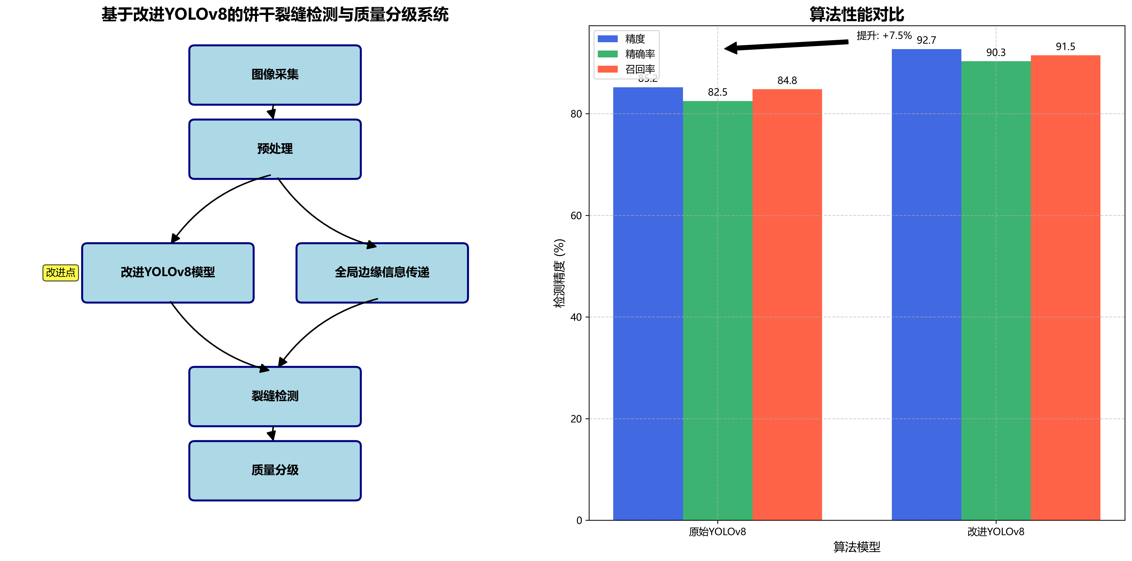 本文提出了一种基于YOLOv8结合全局边缘信息传递的饼干裂缝检测与质量分级系统,通过改进YOLOv8模型架构,引入边缘信息传递机制和注意力机制,显著提升了饼干裂缝检测的准确性。同时,设计了多指标融合的质量分级算法,实现了饼干质量的客观评估。实验结果表明,该系统在保持较高推理速度的同时,检测精度和分级准确性都达到了实际应用要求。